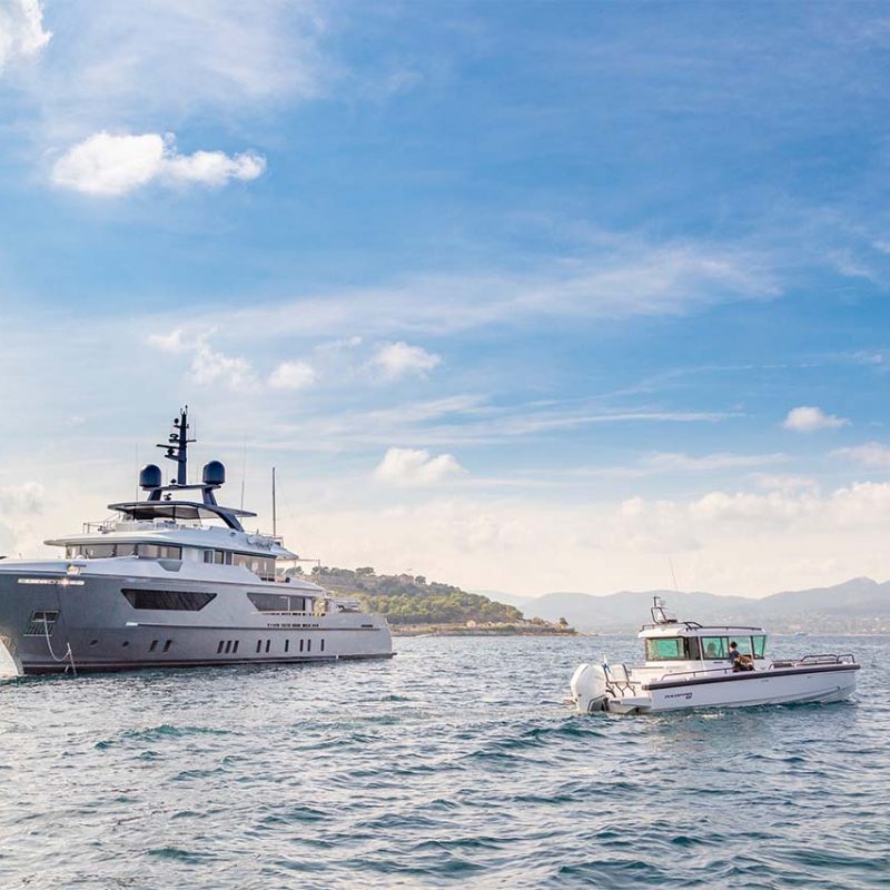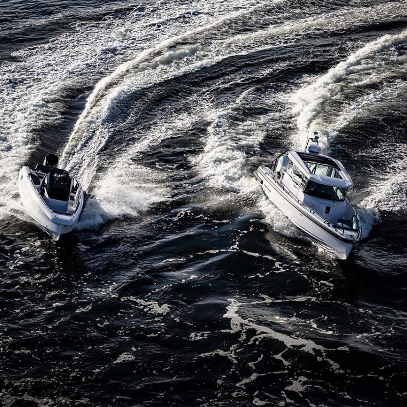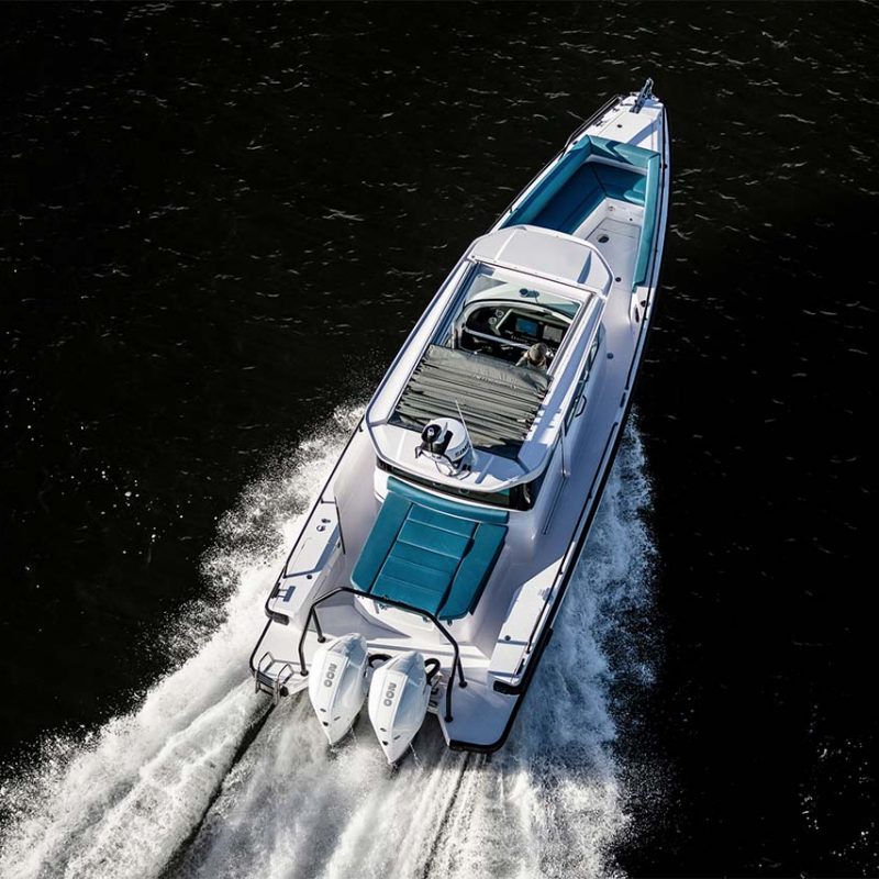 The BRABUS Line Trim Package can be further enhanced by selecting one of our two exciting hull & roof colours: Choose from vibrant and playful Miami Blue, or a more discreet Platinum Grey. The Colour Edition is a duo-tone colour package whereby specific parts of the boat are coloured and other parts are left uncoloured in standard delivery white.