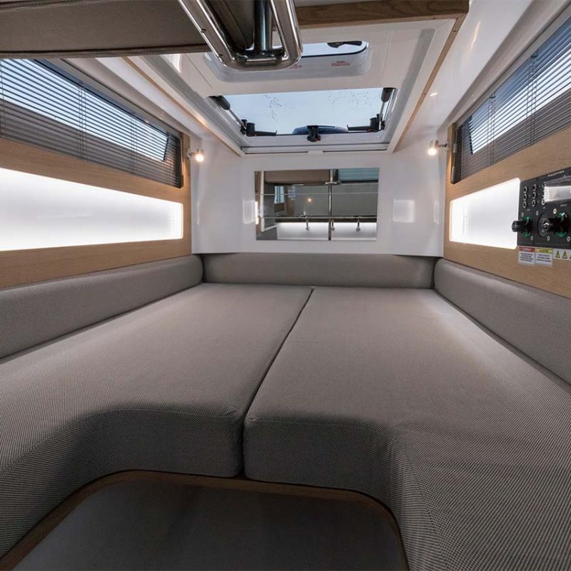 Perfect for an early morning coffee, light lunch or early evening sundowner, the foredeck with an L-shaped sofa and optional table is a perfect place for sitting back and enjoying every moment.