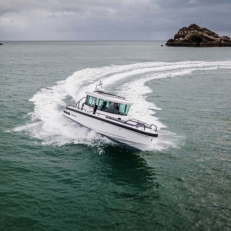 The Axopar 28 Cabin features a spacious, bright, comfortable cabin with wide sliding doors. Above the cabin there’s a full-length Webasto manual sliding canvas roof that loves to be thrown open at any time and large, side-opening doors either side, meaning there’s natural light and ventilation always readily to hand.