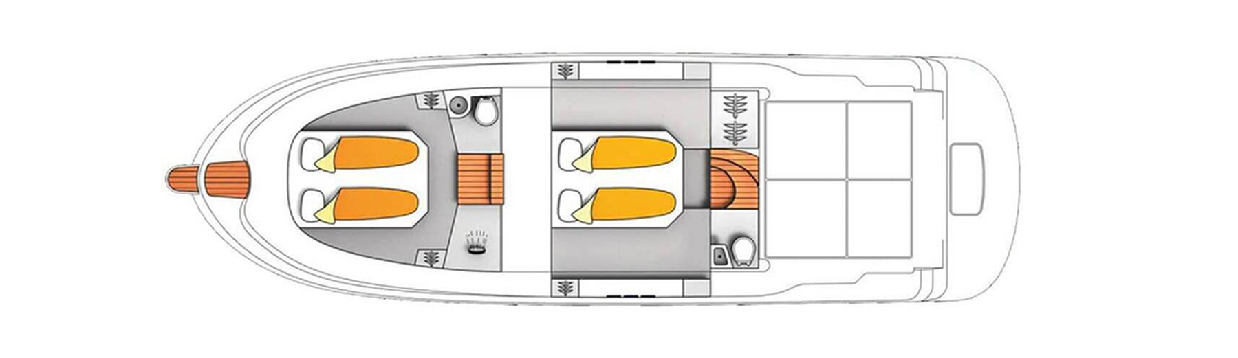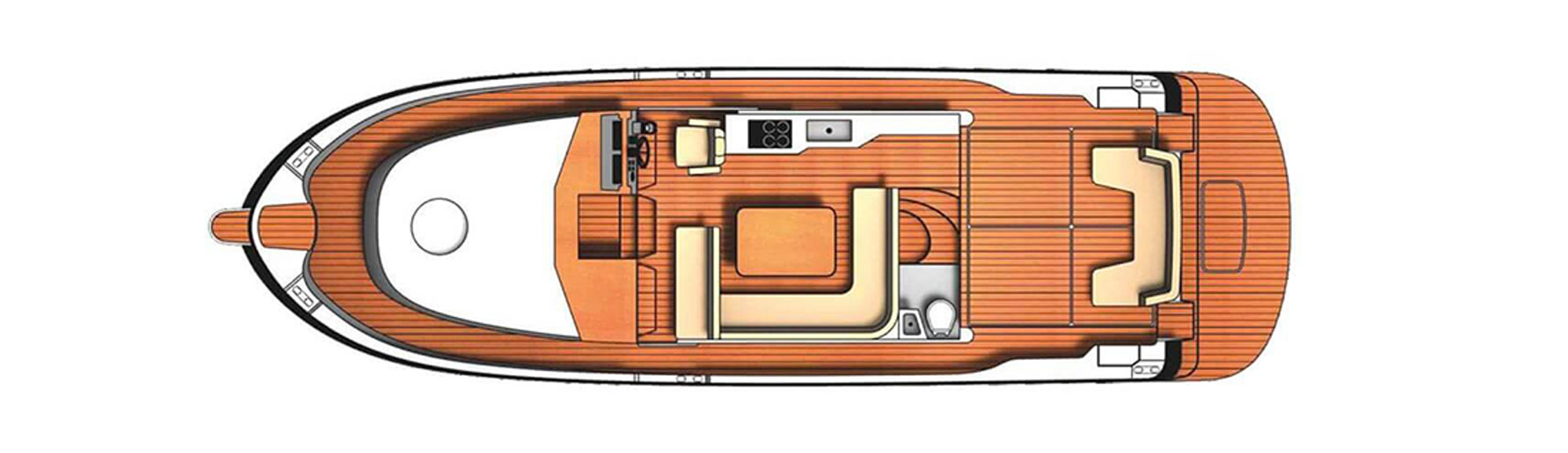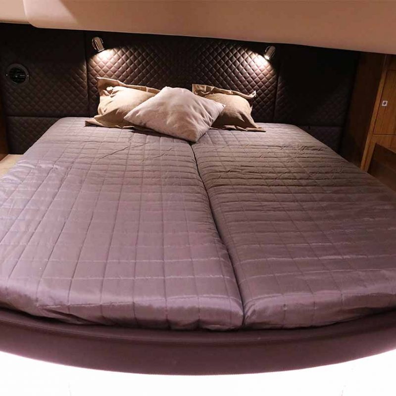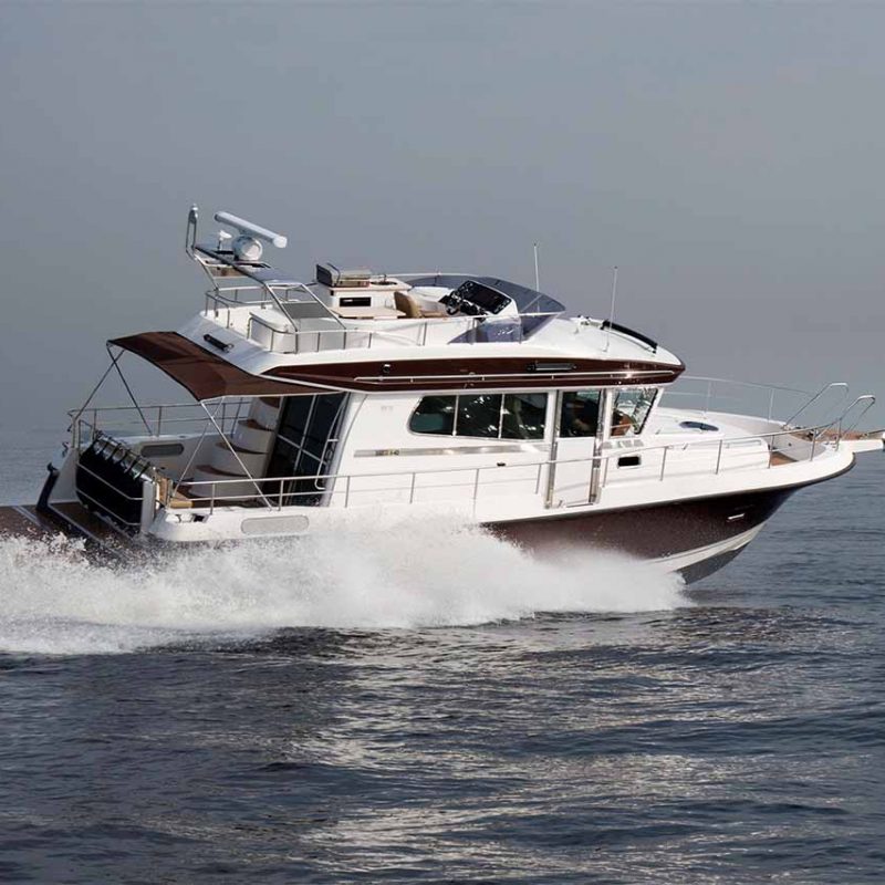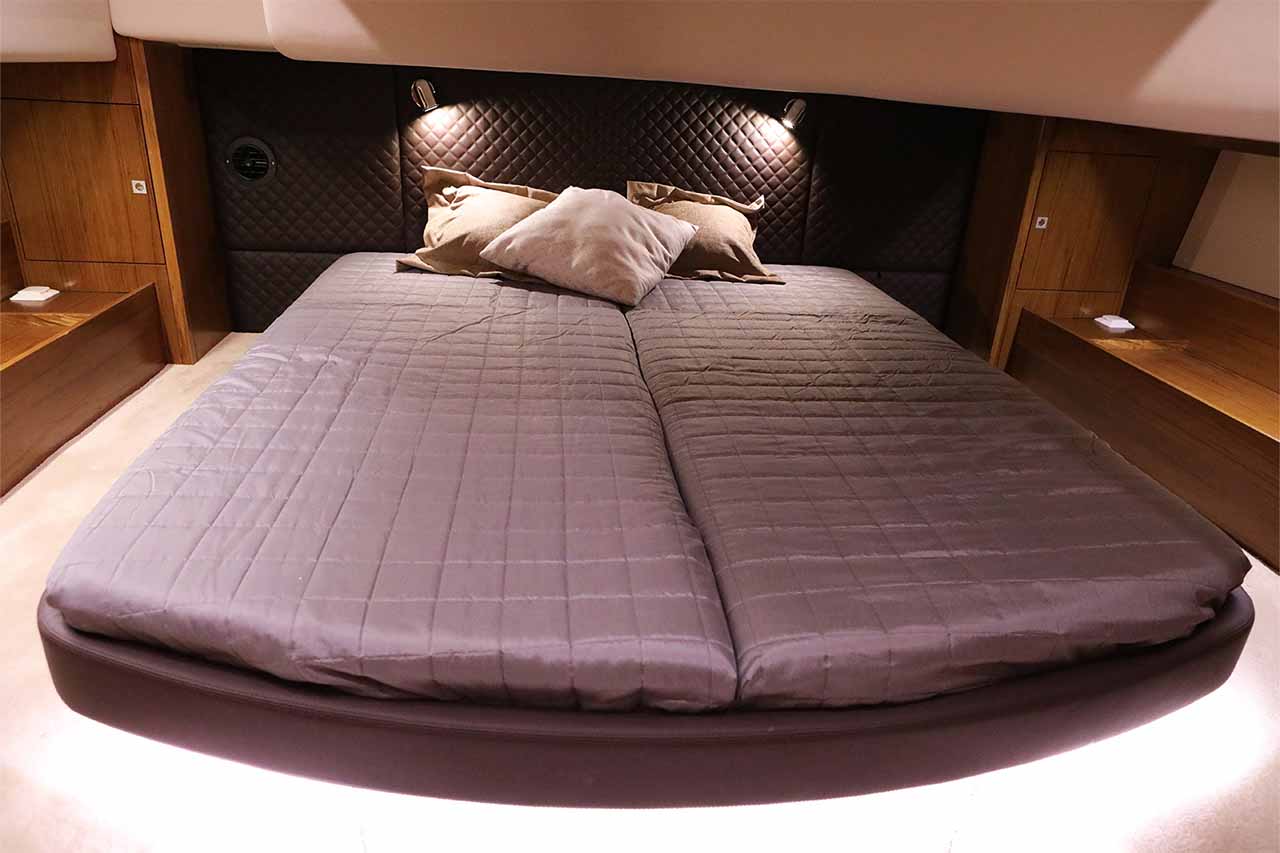 It attracts gazes in the harbor, and it offers exquisite comfort at sea without compromising on efficiency and offshore features. Two separate toilets and a shower together with a large kitchen and luxurious accommodation and living areas ensure enough space for both personal time and socializing. The spacious walkaround deck with handrails ensures safe, fast and unobstructed passage around the boat. The flybridge is available as an accessory, providing shelter for rain and a luxurious balcony with panoramic views for sunny days. The materials and equipment of the interior can be customized according to the customer’s wishes.