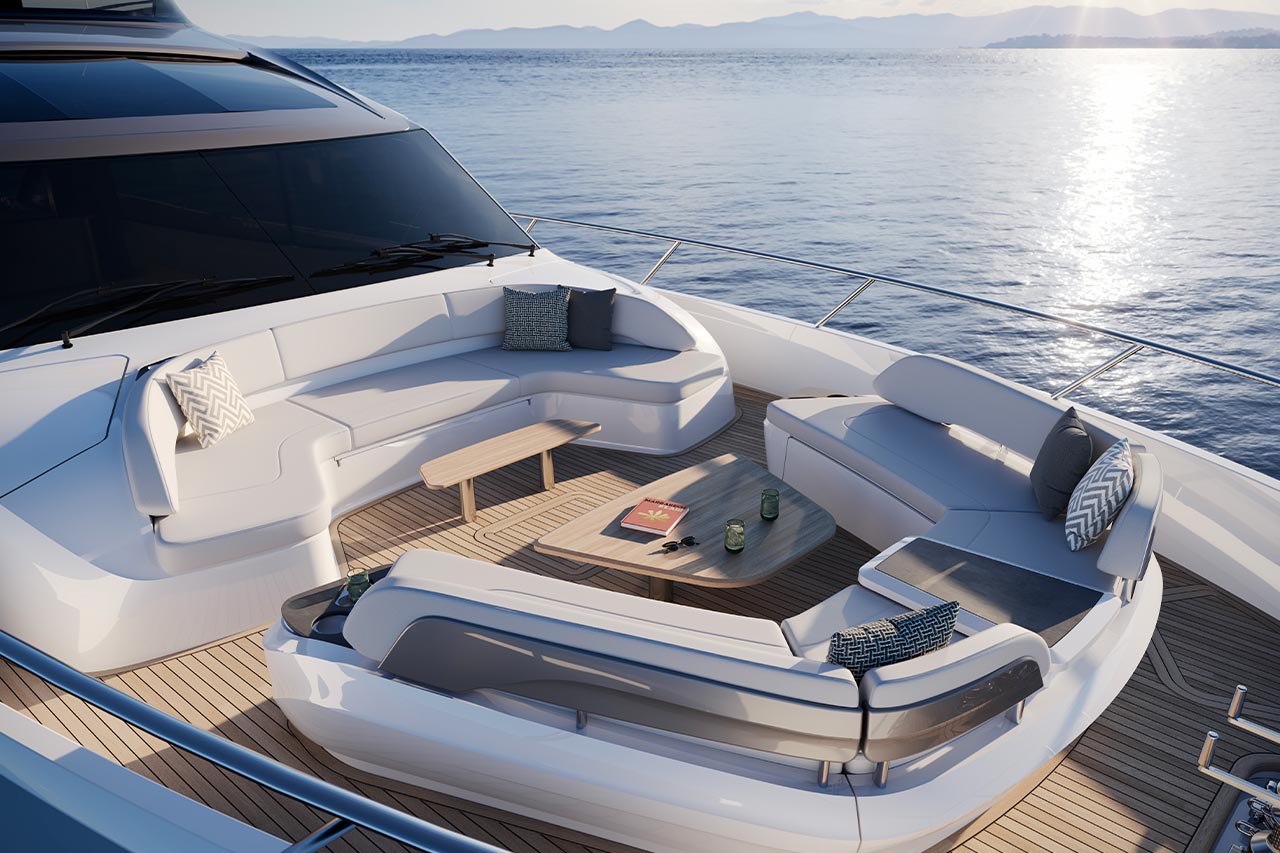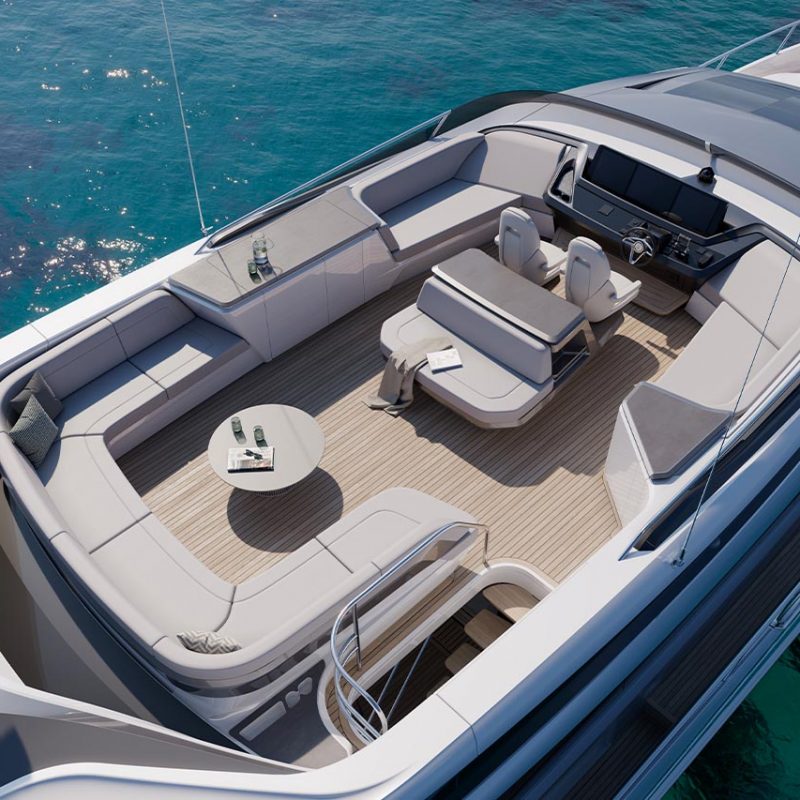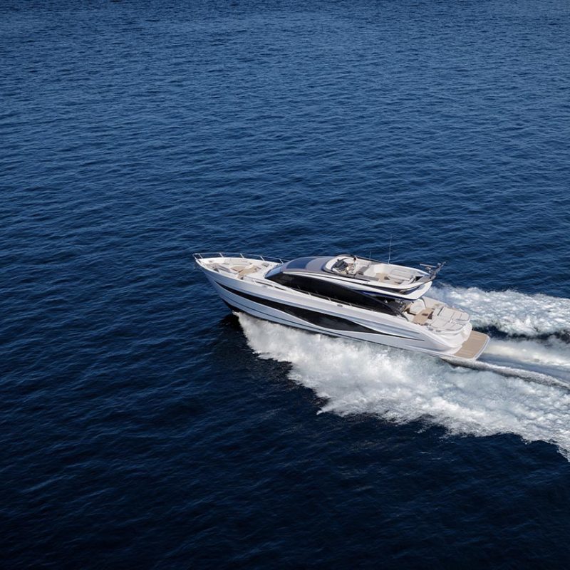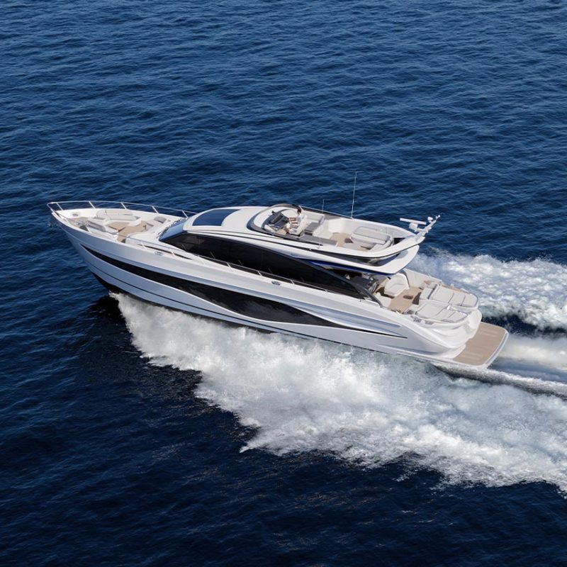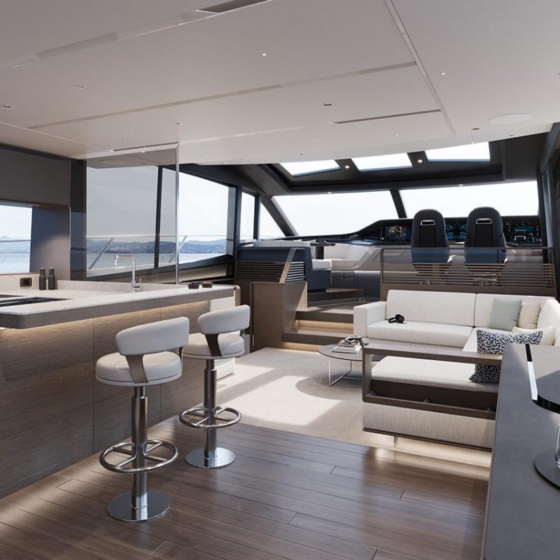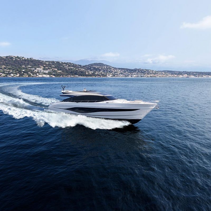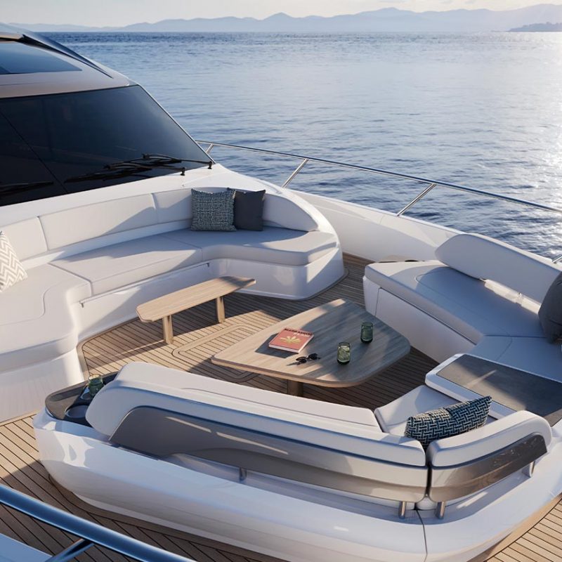 High bulwarks complete with oval stainless-steel rails, a vast teak laid deck, and tailored natural materials define the flagship status of this new S Class model, blending luxurious and contemporary finishes in perfect harmony.The latest edition to the S Class sportbridge range, the all-new Princess S80. Featuring Princess’ latest sweeping design language, the S80 is designed in collaboration with naval architects Olesinski and Italian design house, Pininfarina. The versatile layout of the all-new S80 allows her to be managed as an owner operated vessel with a vast open saloon and raised helm or discreetly crewed, with the option of an enclosed helm plus crew accommodation for up to 3.