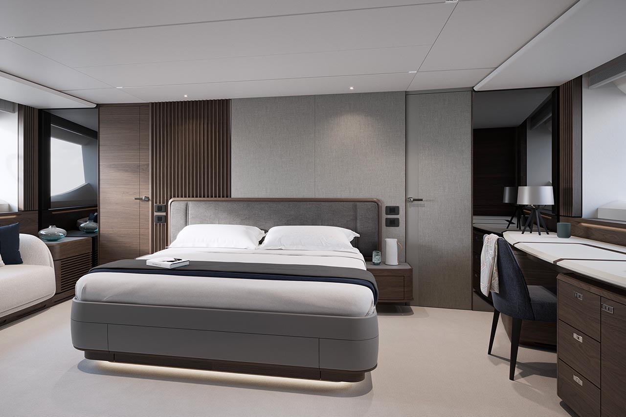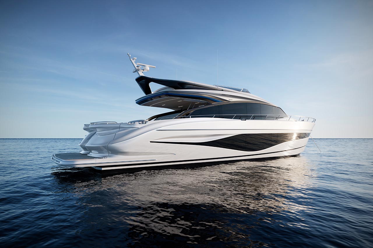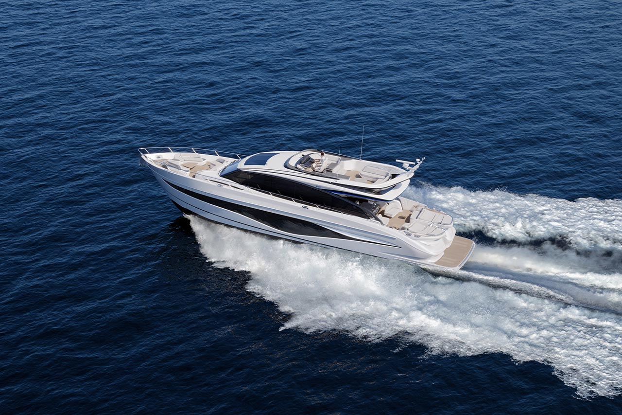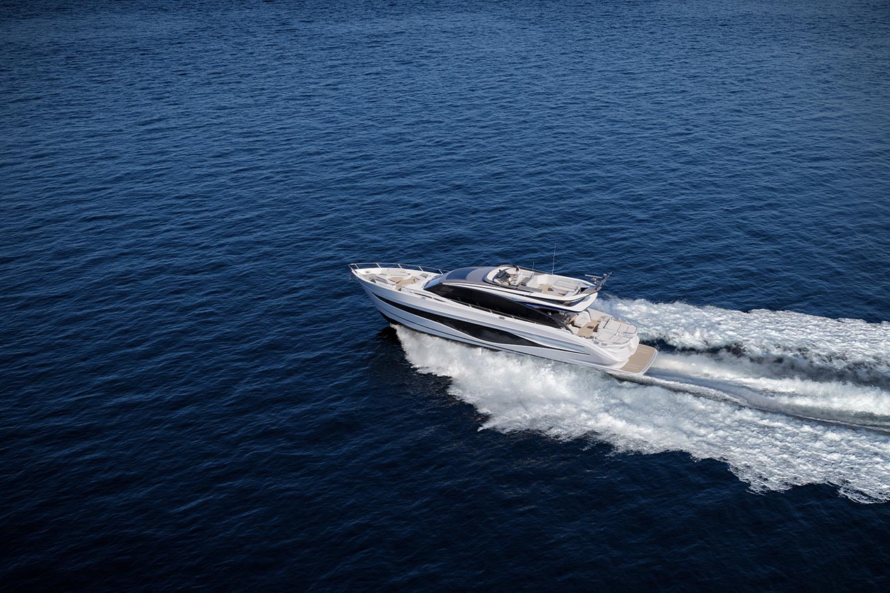 High bulwarks complete with oval stainless-steel rails, a vast teak laid deck, and tailored natural materials define the flagship status of this new S Class model, blending luxurious and contemporary finishes in perfect harmony.The latest edition to the S Class sportbridge range, the all-new Princess S80. Featuring Princess’ latest sweeping design language, the S80 is designed in collaboration with naval architects Olesinski and Italian design house, Pininfarina. The versatile layout of the all-new S80 allows her to be managed as an owner operated vessel with a vast open saloon and raised helm or discreetly crewed, with the option of an enclosed helm plus crew accommodation for up to 3.