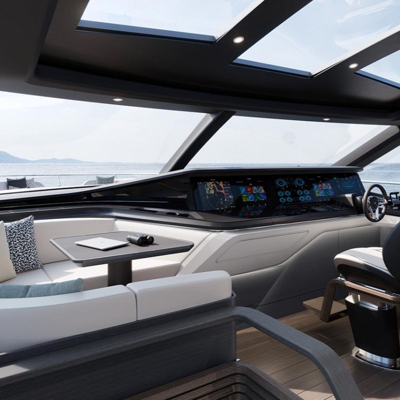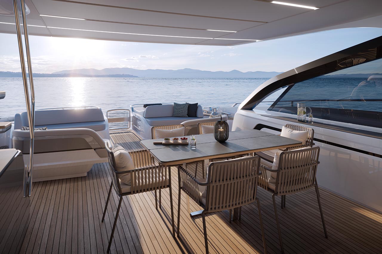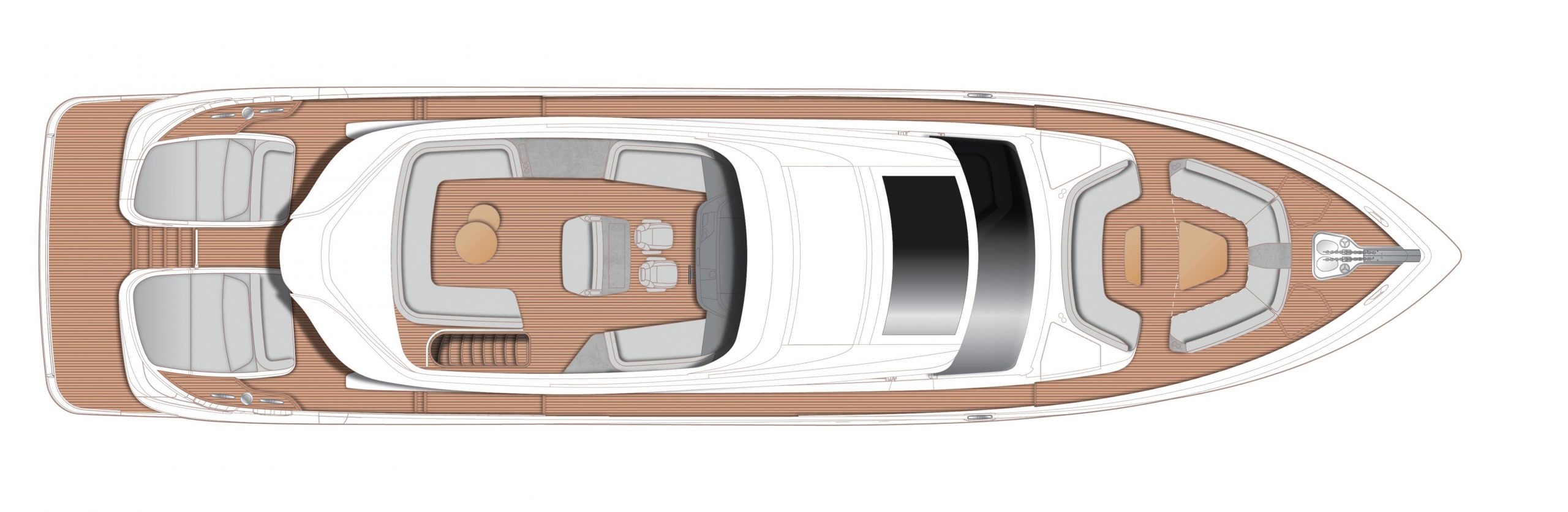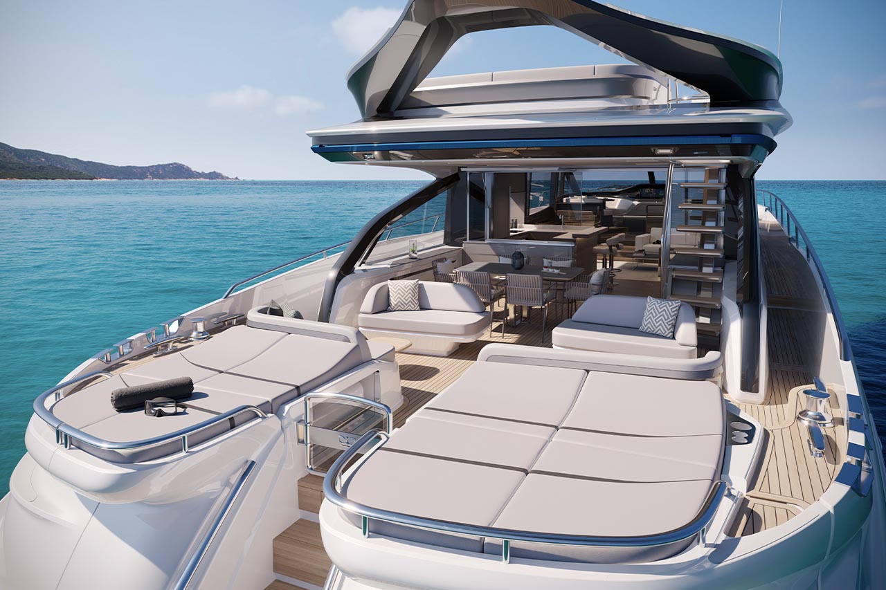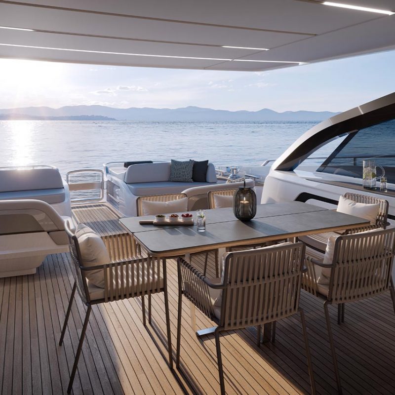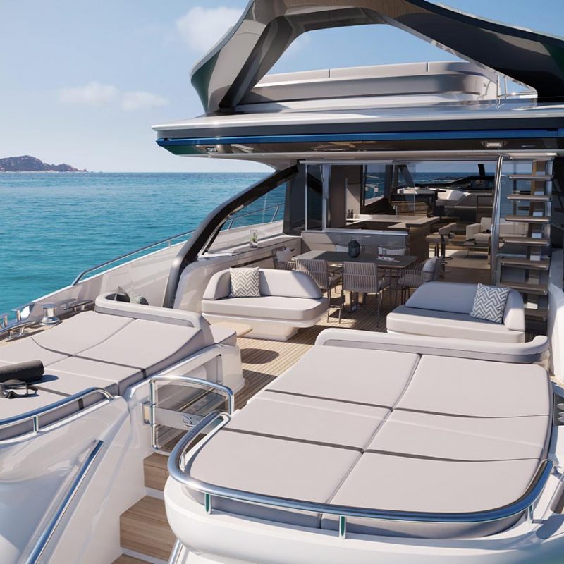 Unique central access from her hydraulic bathing platform to the cockpit passes between twin sunpads whilst her foredeck features innovative seating with sunpads which can be converted to create additional aft facing seats.ELEGANCE