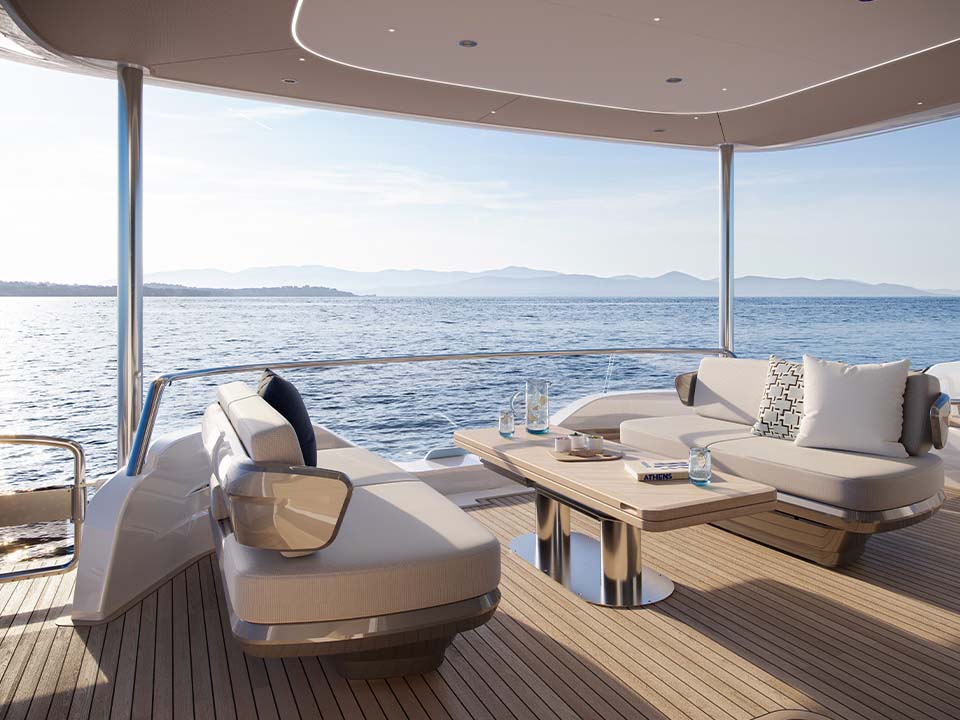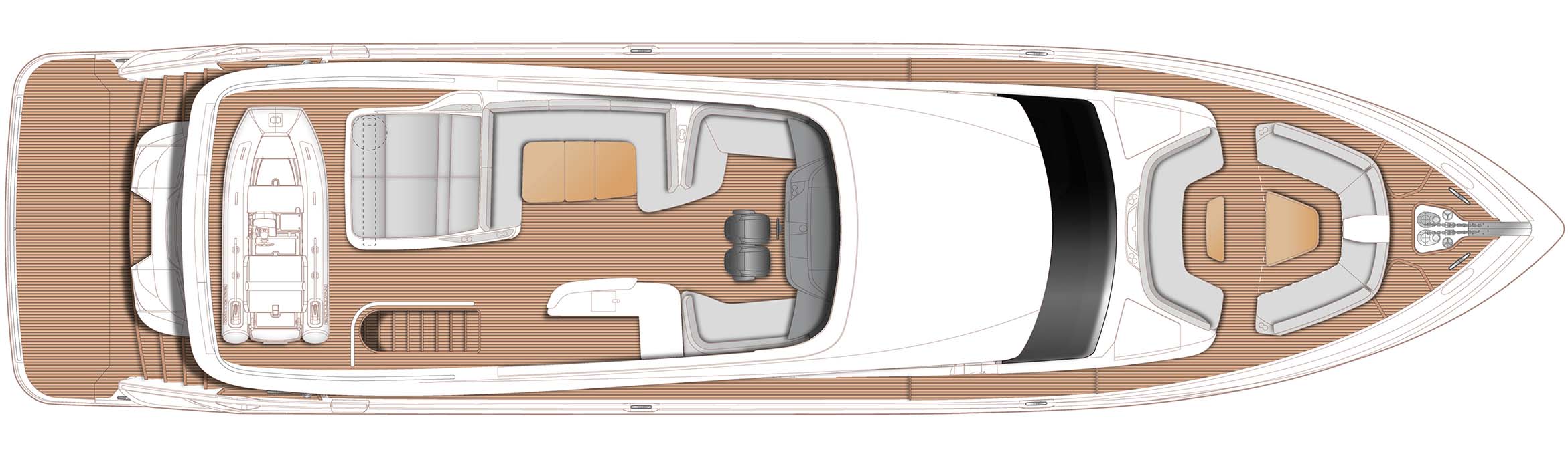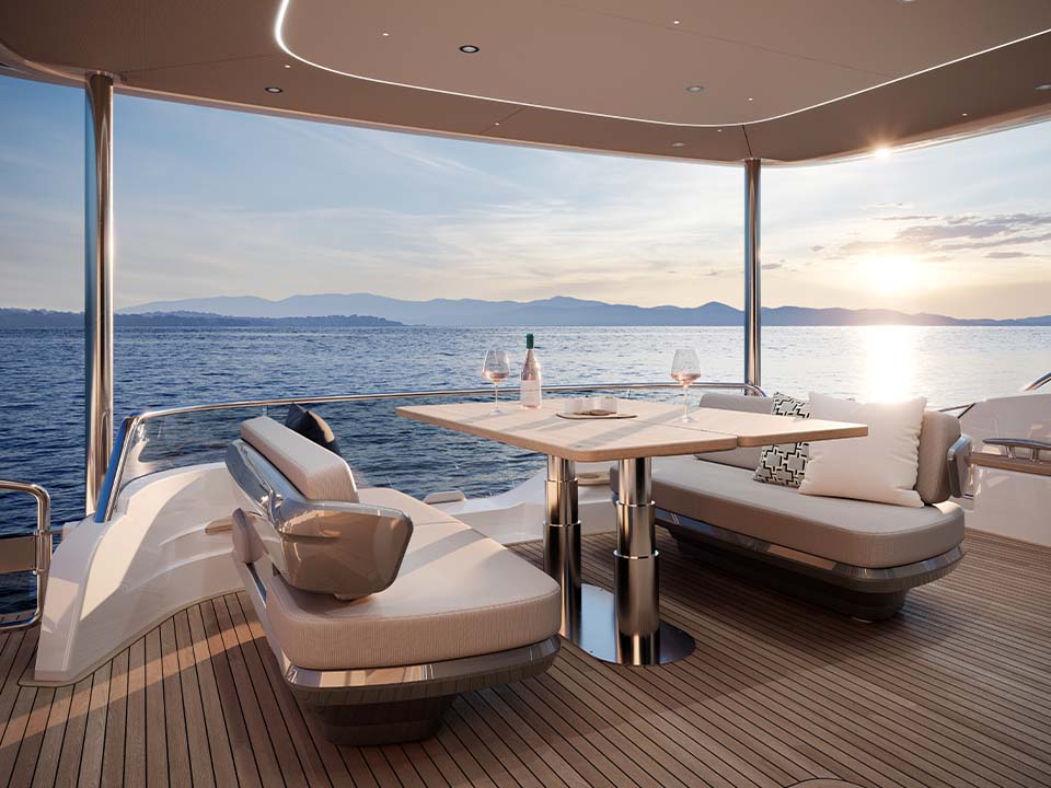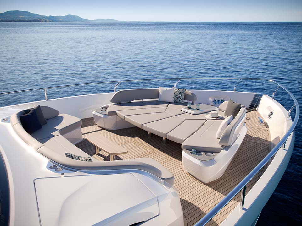Her flybridge offers relaxed seating and dining areas combined with a fully equipped wetbar. Owners' can choose to specify the flybridge layout to their requirements with the option of a crane for a tender hidden within the large sunpad, free standing sun loungers or a spa bath.