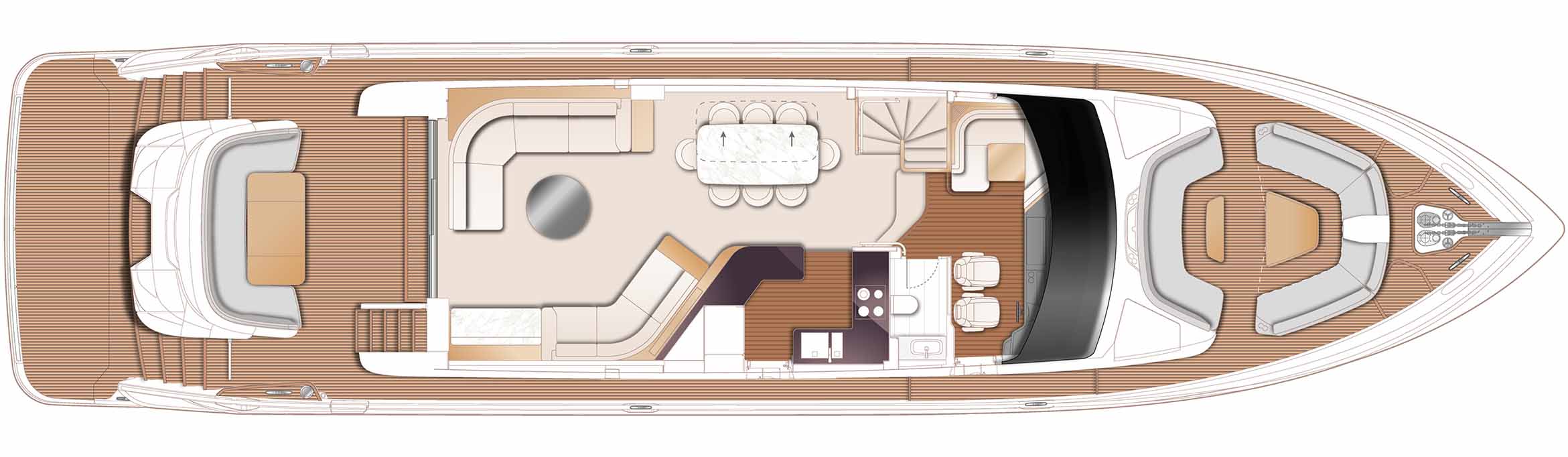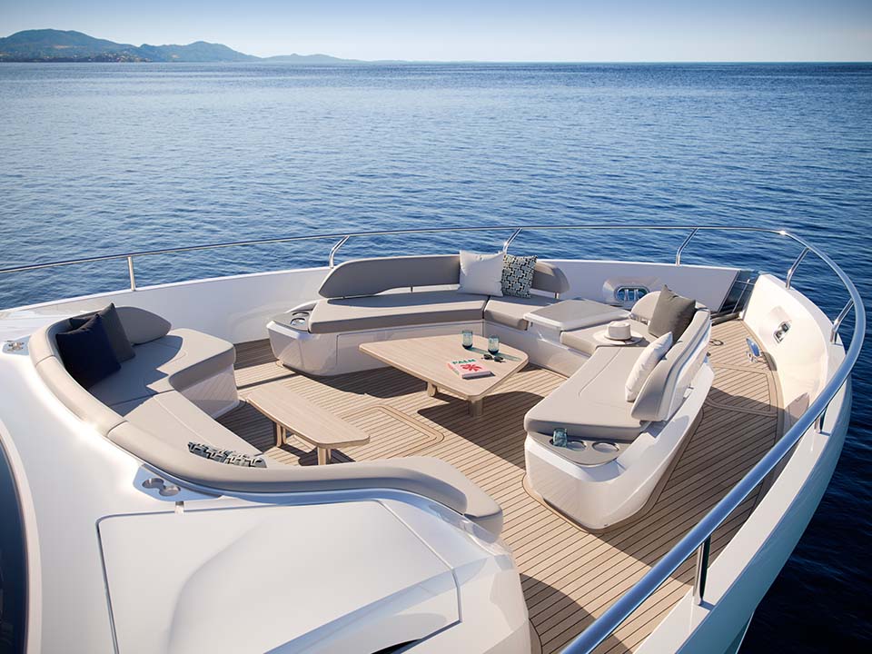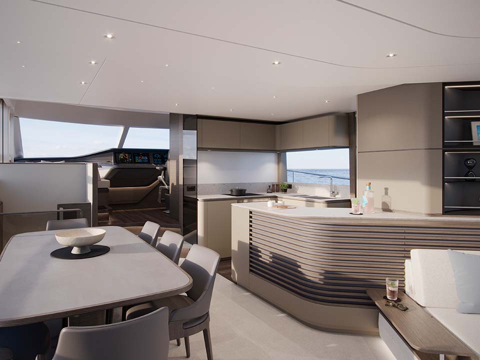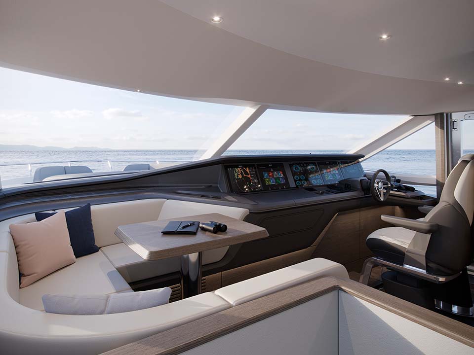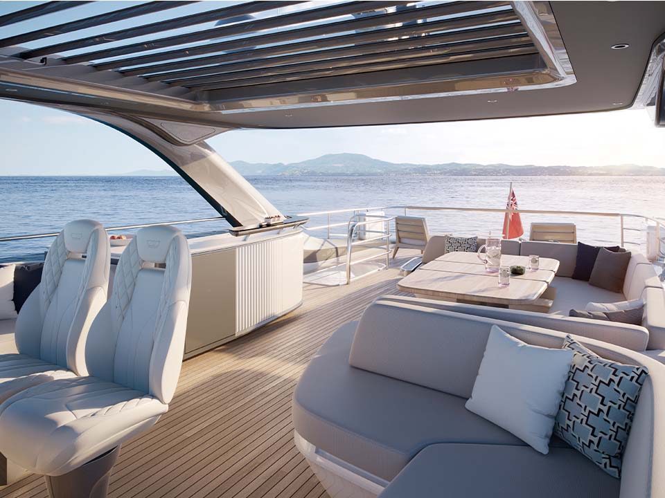 Her flybridge offers relaxed seating and dining areas combined with a fully equipped wetbar. Owners' can choose to specify the flybridge layout to their requirements with the option of a crane for a tender hidden within the large sunpad, free standing sun loungers or a spa bath.
