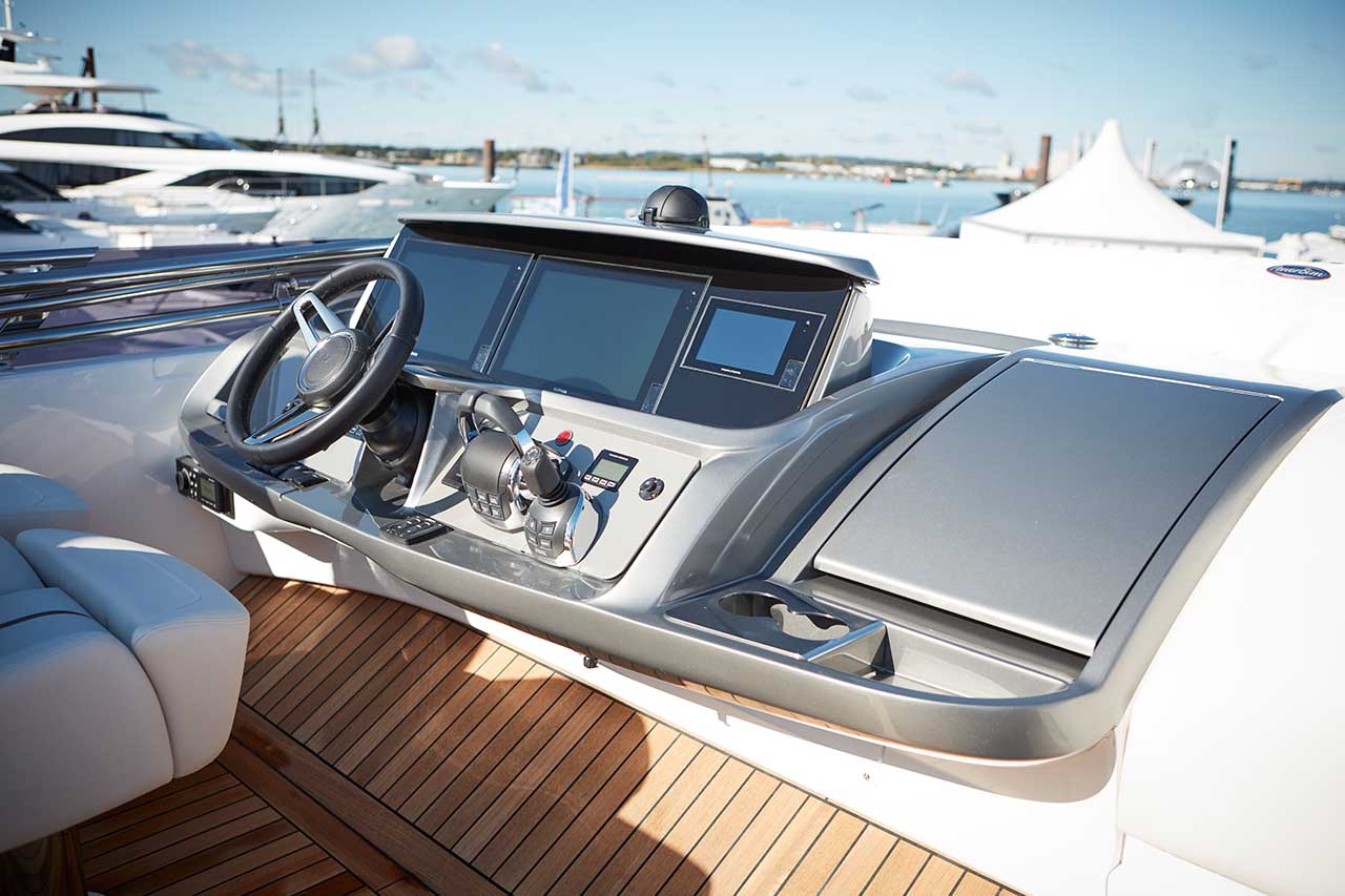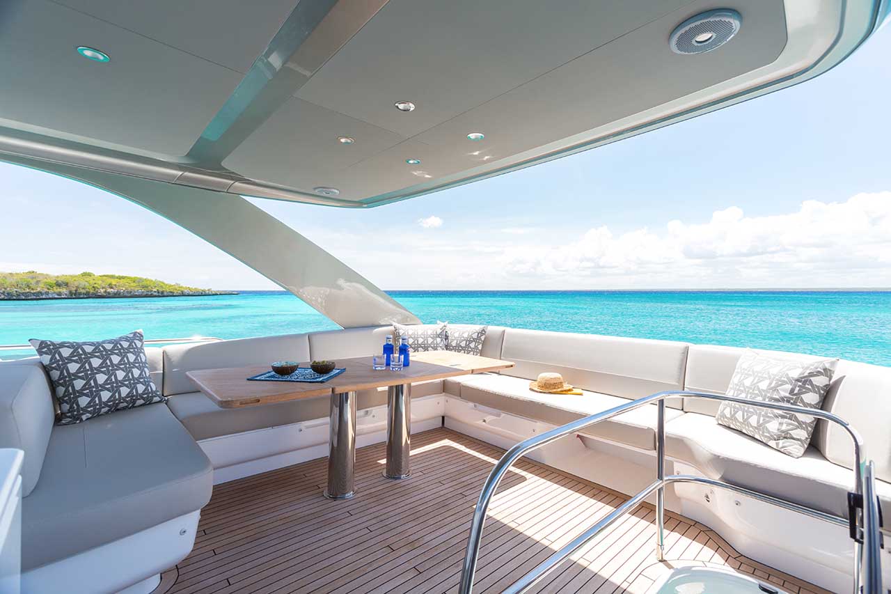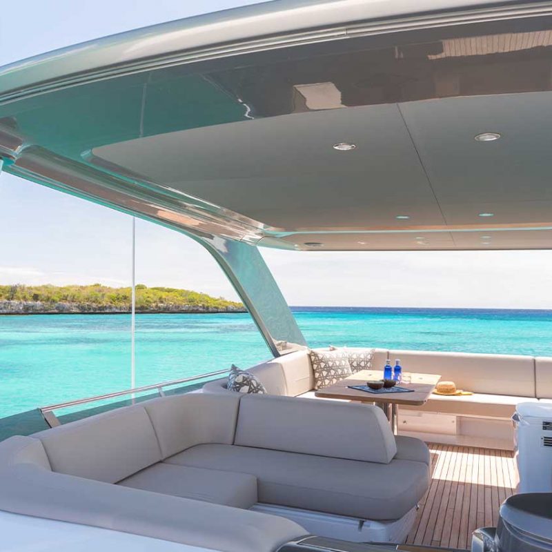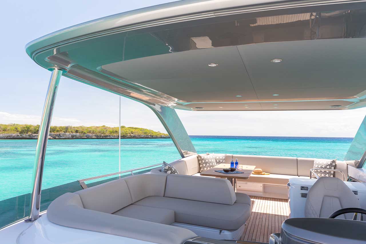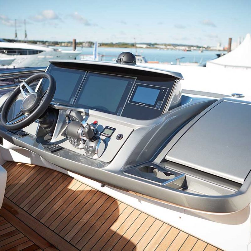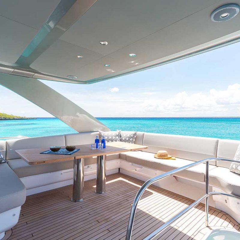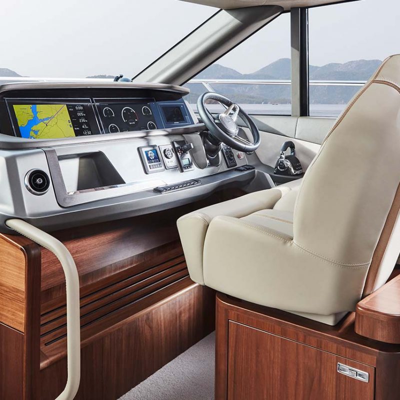 The award-winning Princess F55's 17.80m2 flybridge enjoys a convertible sunbed, twin helm seats, a wetbar and ergonomic dining areas. Vast panoramic saloon windows and signature wrap around front screens offer uninterrupted vistas from the main deck whilst expansive hull windows generously flood her accommodation areas with light.ELEGANCE