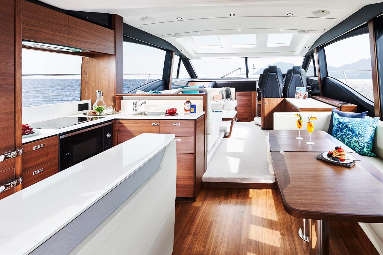 Stylish, contemporary, timeless, quietly confident, memorable, seamlessly executed and beautifully finished.When at anchor her electro-hydraulic bathing platform creates a convenient launch system for a 3.3m tender, a jet ski, or simply a secluded swimming platform. Her sociable galley aft arrangement features an open-plan dining area with sliding doors and a fully opening window leading out to the cockpit.