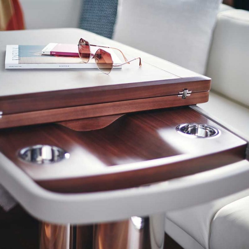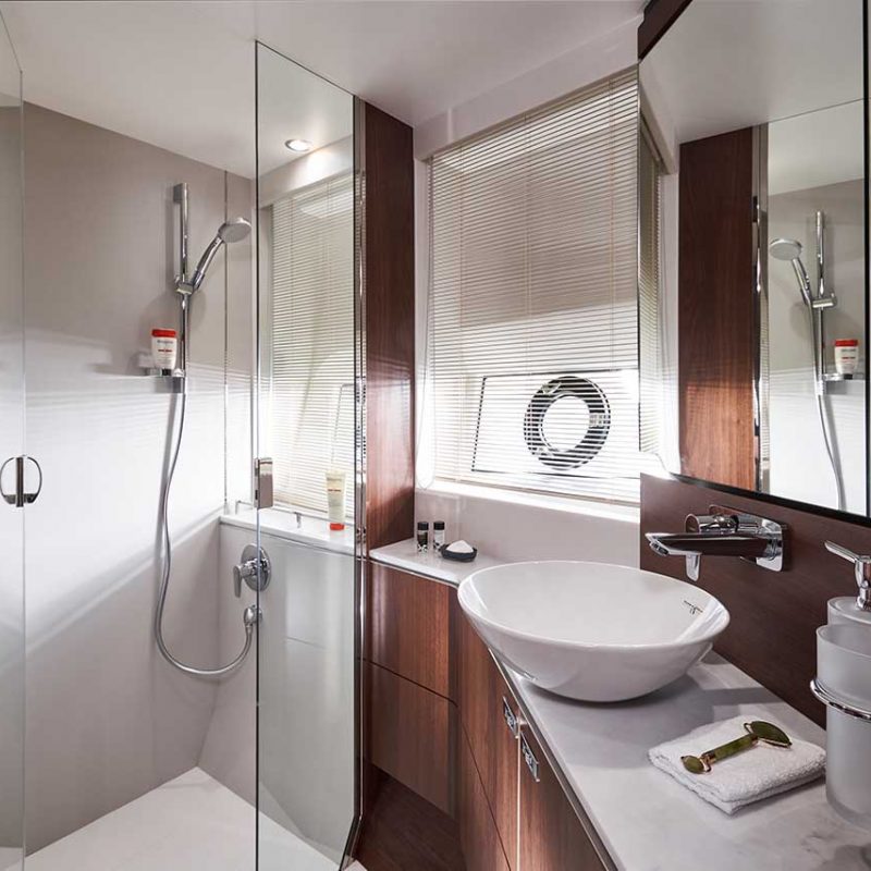When at anchor, peacefulness descends onto her generously appointed deck areas, which include a spacious foredeck seating area, whilst her hydraulic bathing platform and 3.3m tender garage become the perfect base for watersports.HOSPITABLE