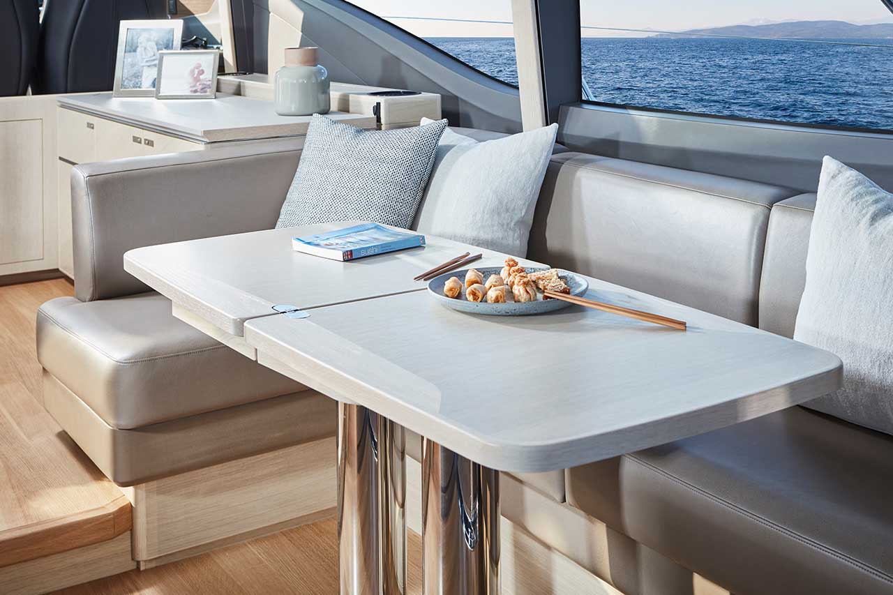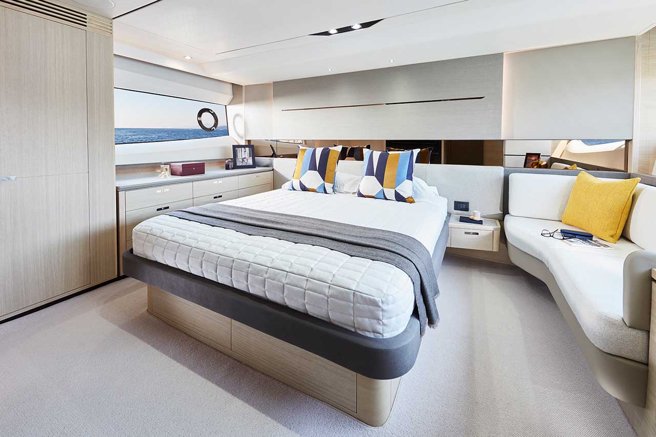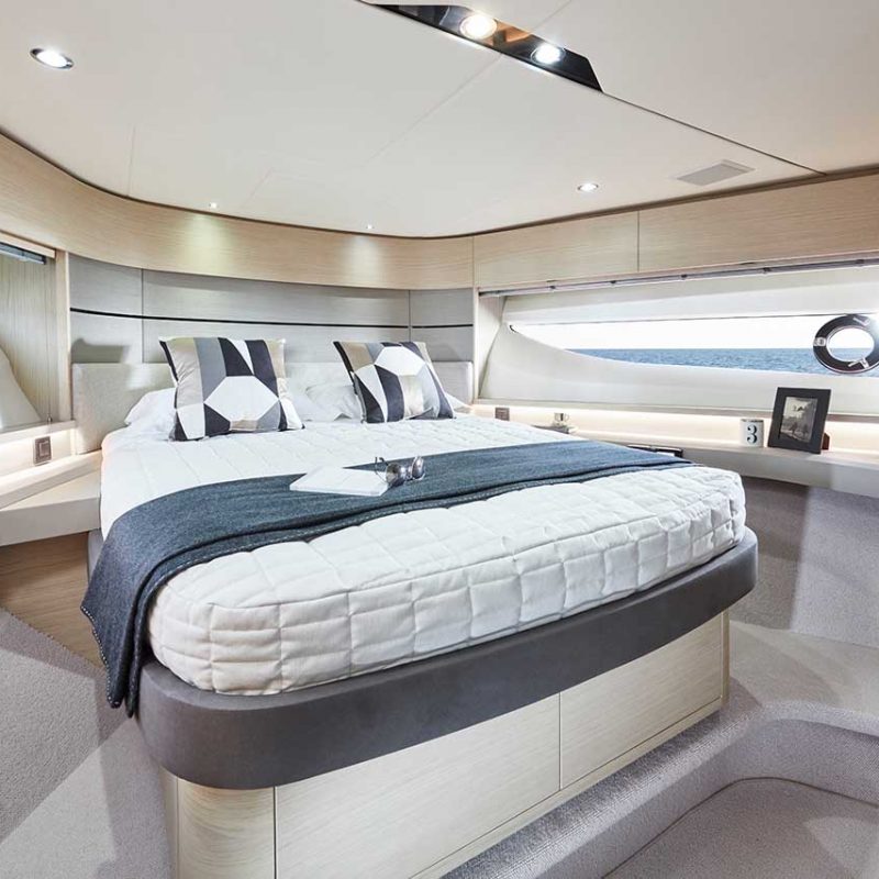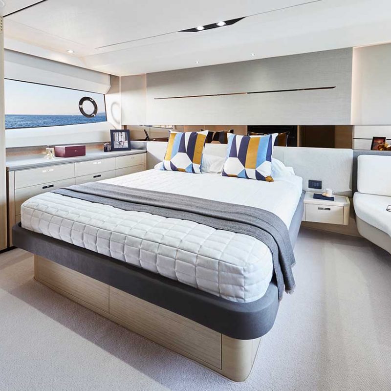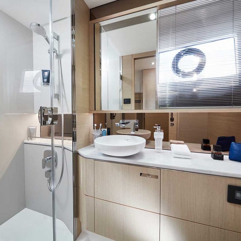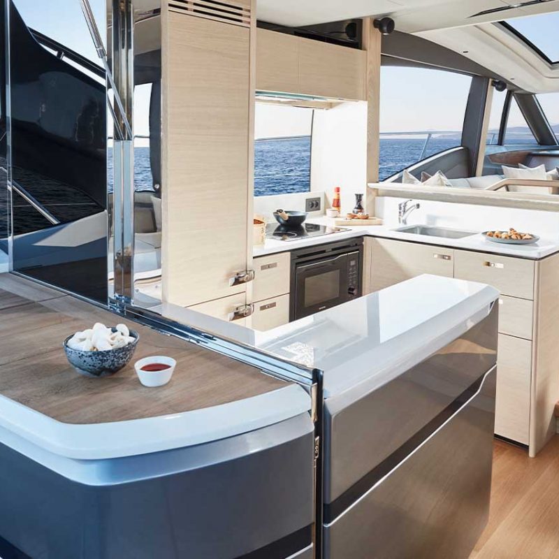 The elegant lines of the V60 encapsulate an expansive and sociable cockpit arrangement with a generous seating area and fully equipped wetbar with barbecue. Below deck, six guests are comfortably accommodated across an en suite full-beam owner’s stateroom and two further guest cabins with the option of an additional crew cabin.