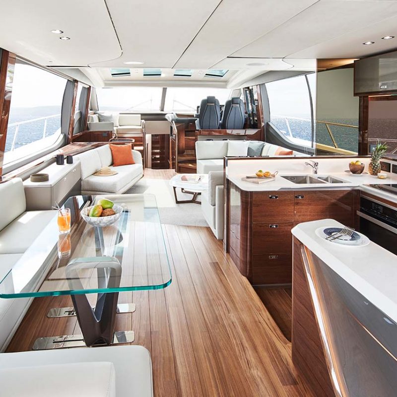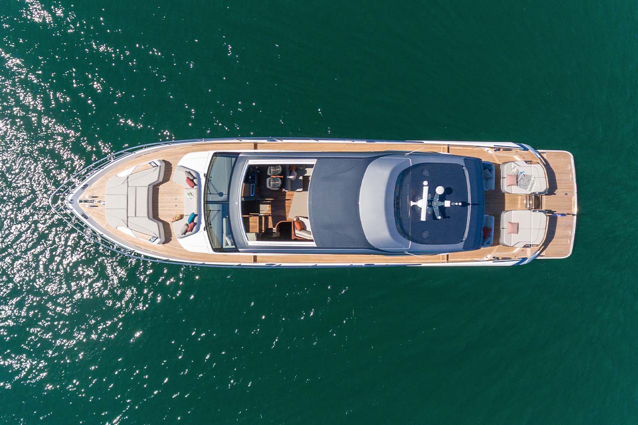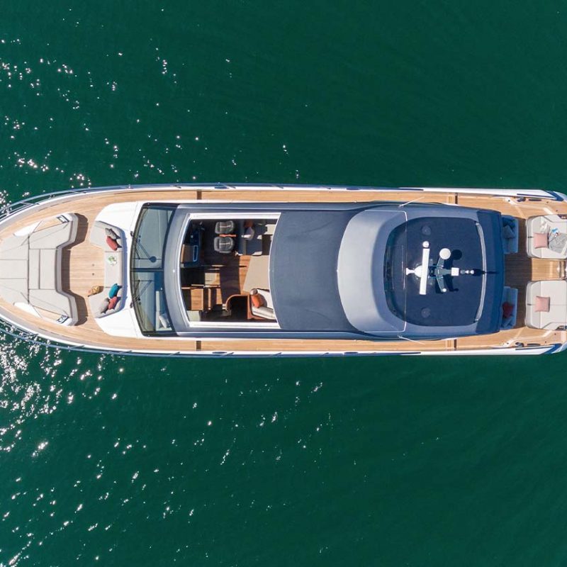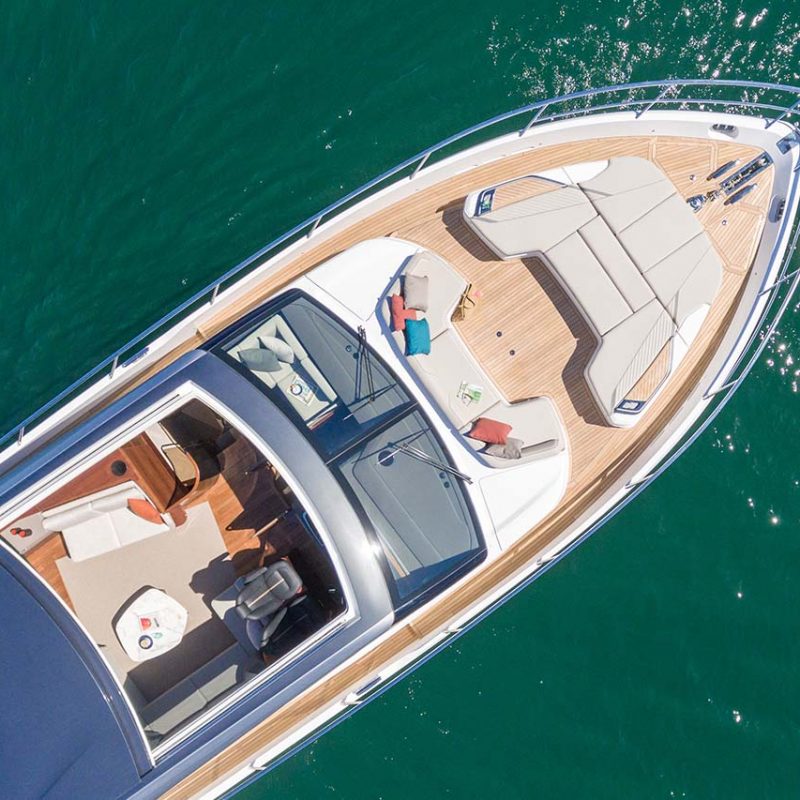 Central access from the hydraulic bathing platform leads you between twin sunbeds to a configurable cockpit then onwards to her well-quipped galley, dining area and saloon. Her foredeck features innovative seating with sunpads which can be converted to create additional aft facing seats.Her cavernous main deck saloon opens up through an electric roof above, or seamlessly to the outside through full length side windows.