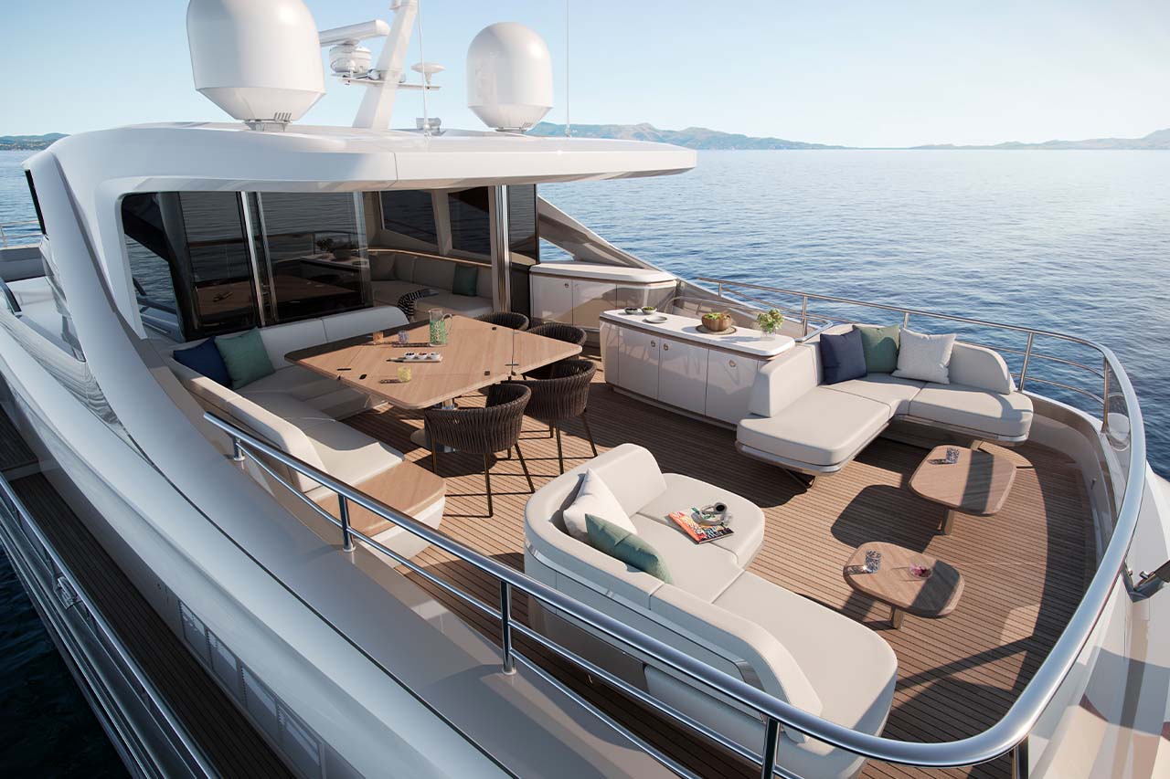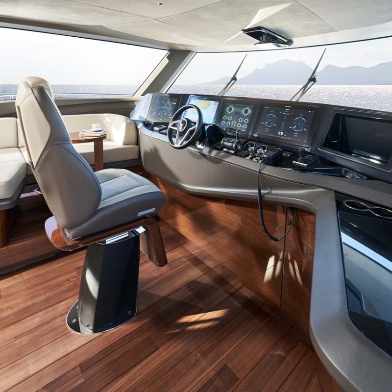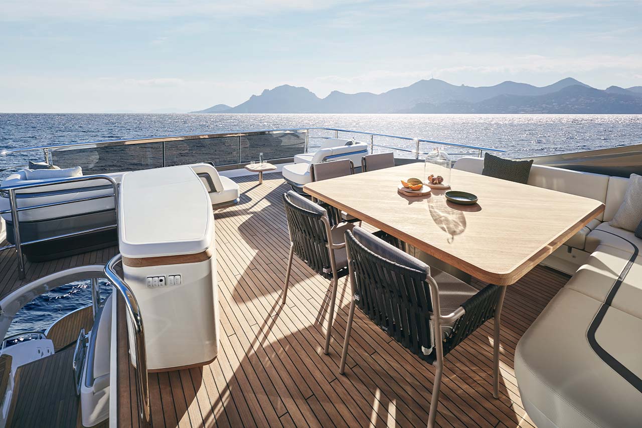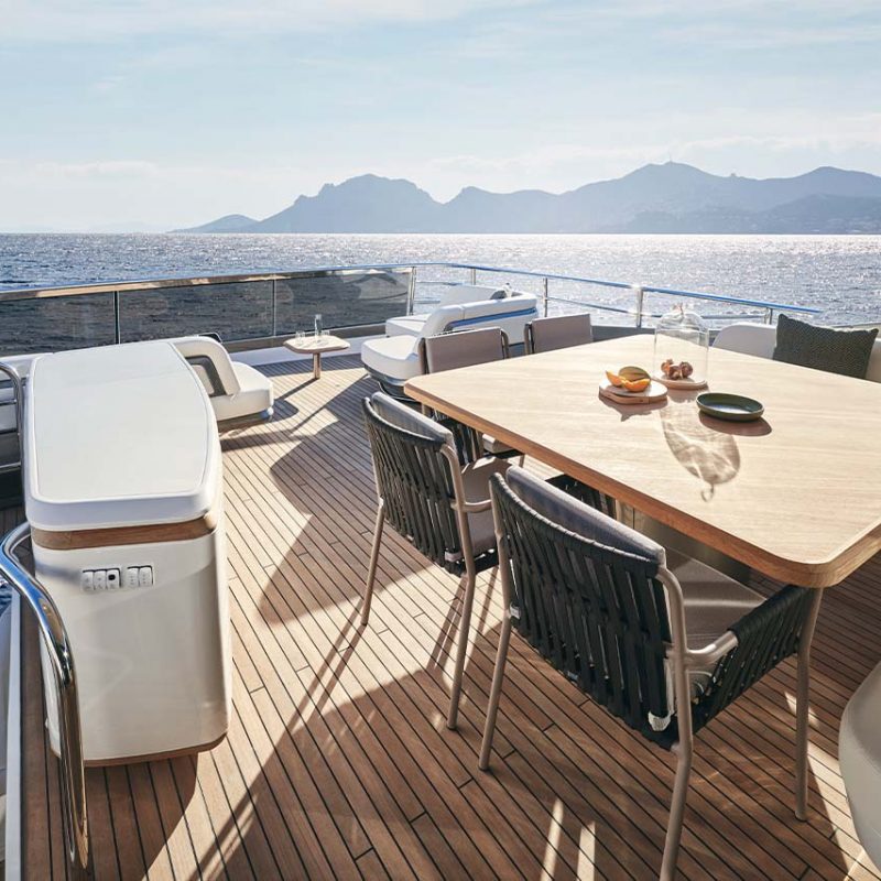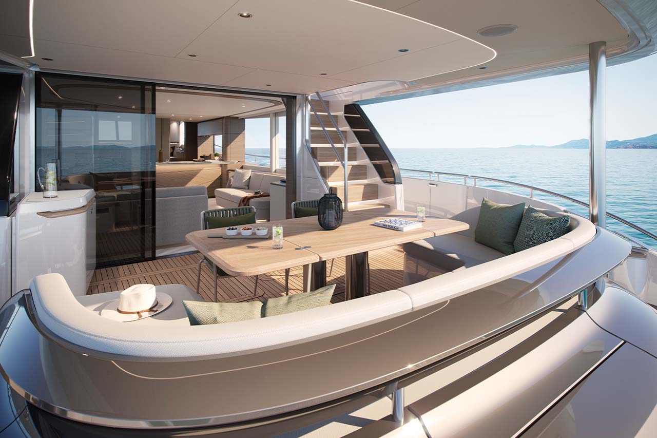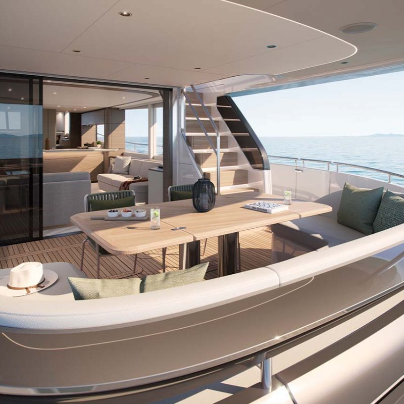 The X80 brings the outside in through the maximisation of glazing which flows along the entire length of the main deck encasing the saloon, galley and forward dining area.