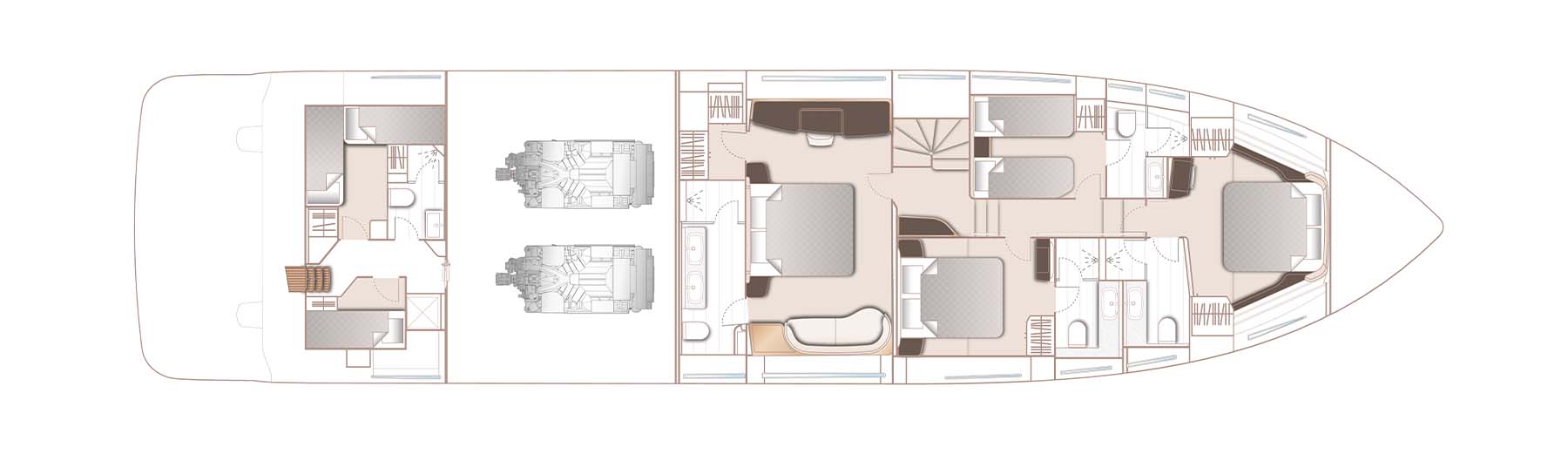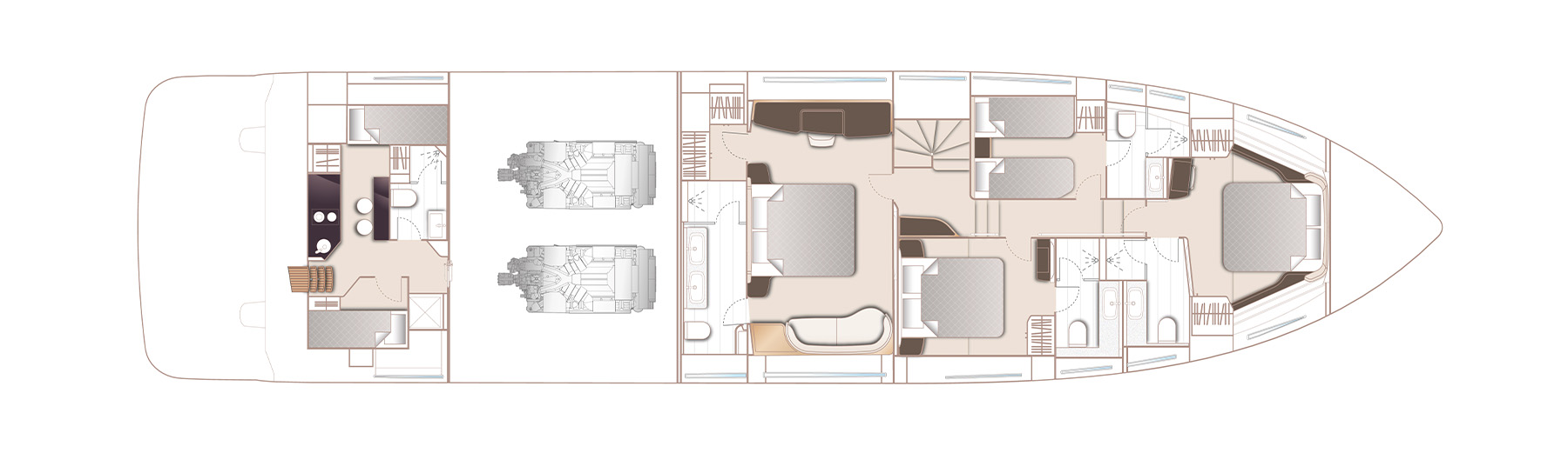 The X80 accommodates 8 guests across 4 en-suite cabins, a full beam master stateroom located amidships, a forward guest stateroom, a double guest to starboard and a twin cabin to port.